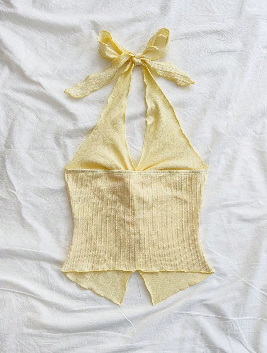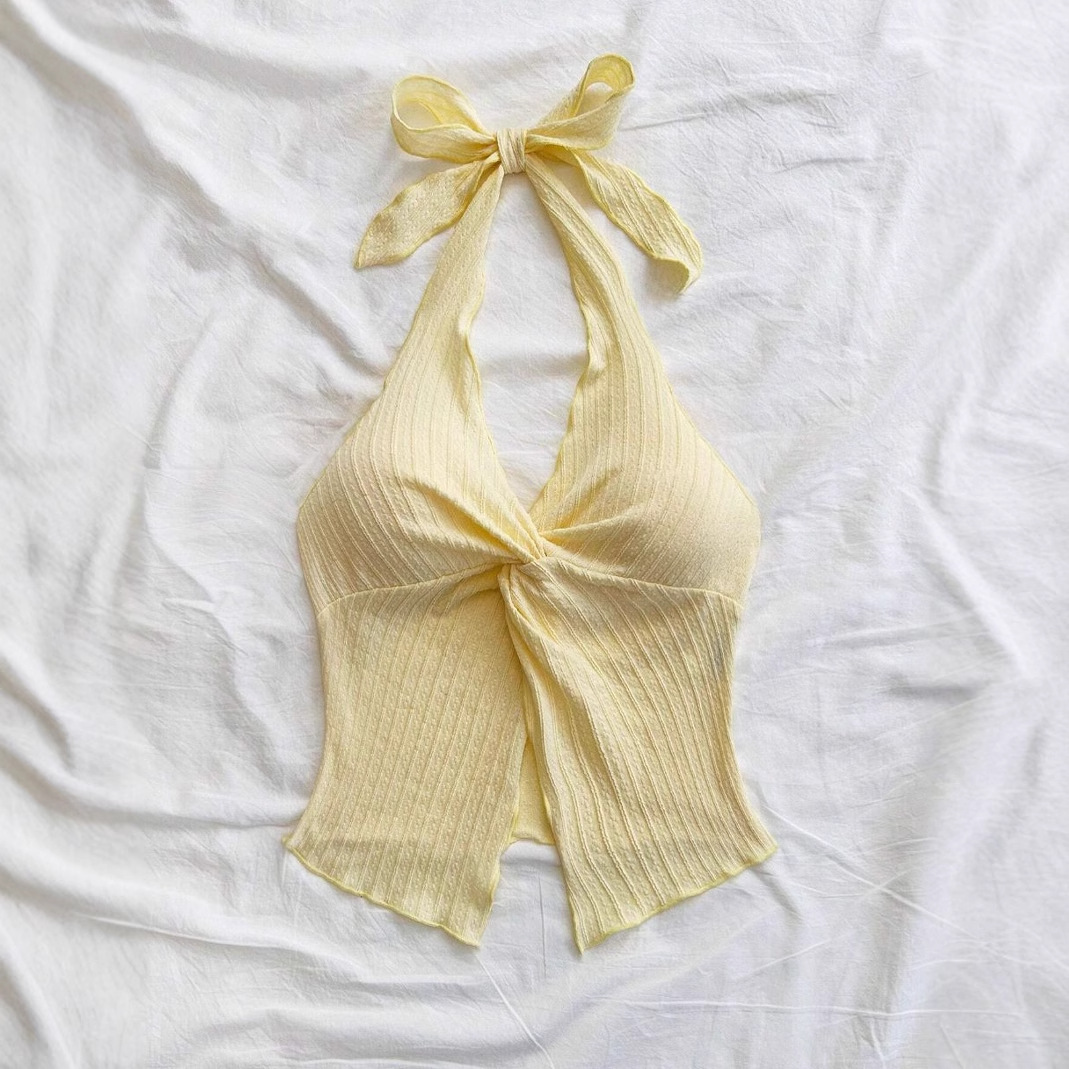 A fresh and playful halter top designed in a butter yellow hue with a flattering twist-front detail. The ribbed texture and adjustable bow-tie neck create a feminine silhouette, making it the perfect piece for sunny days, vacations, or casual outings.