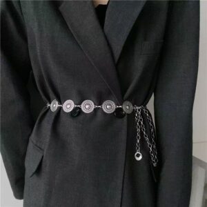 This stylish silver coated waist belt features beautiful engraved coin and butterfly designs with delicate chain details.